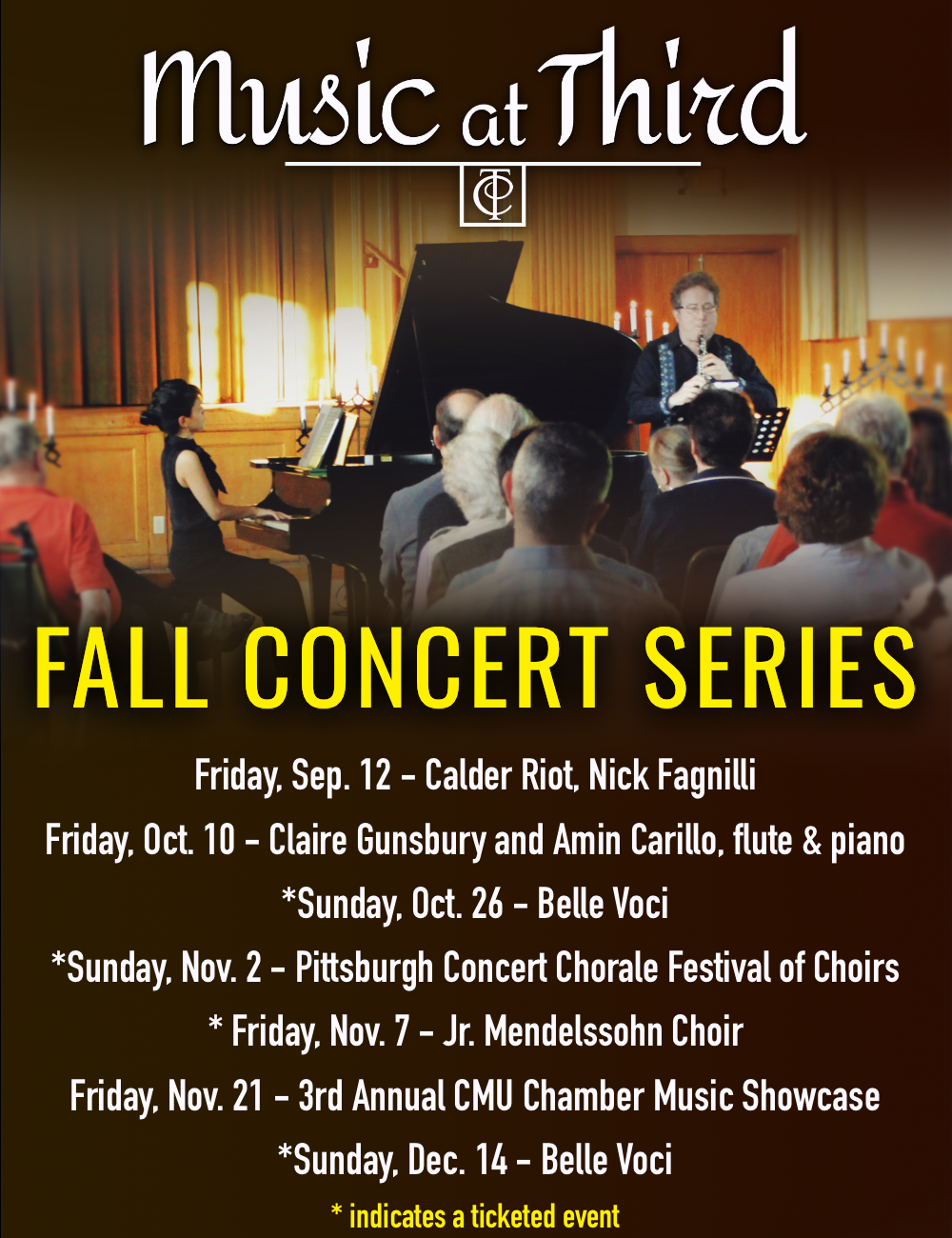 It’s time once again for Music at Third’s Fall Concert Series! This year’s festivities include a mix of events that are admission by free-will donation, and events that require the purchase of tickets. Please be sure to check event’s information page regarding admission information, and thank you for supporting Music at Third!